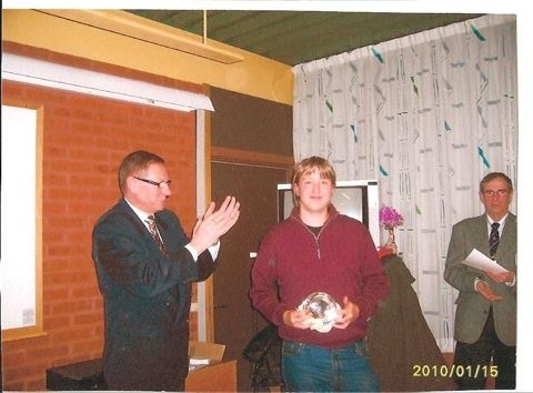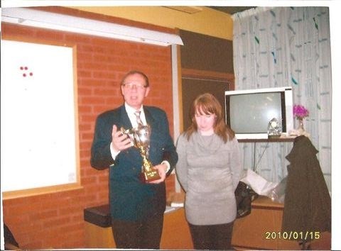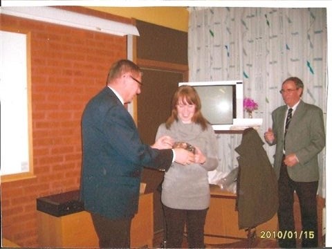 Förbundsordförande Ingvar S Klang tilldelar Linda Strand Karlstad-Ulvsby priset som Värmlands skytteförbunds bäste skytt 2009.